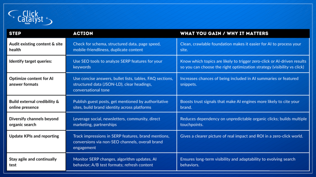 In 2025 and beyond, SEO isn’t just about ranking on page 1 anymore. With the rapid rise of AI-powered search engines and zero-click results, the rules of the game have changed, and marketers need a fresh playbook. At Click Catalyst Media, we believe that mastering this shift isn’t optional; it’s essential for staying relevant, visible, and trusted.